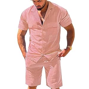 JoZorro Men’s 2 Pieces Cotton Linen Set Button Down Shirt Long Sleeve Casual Beach Shorts Summer Yoga Outfits Pink