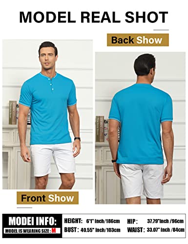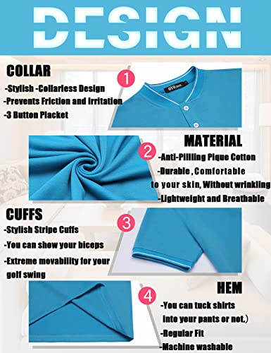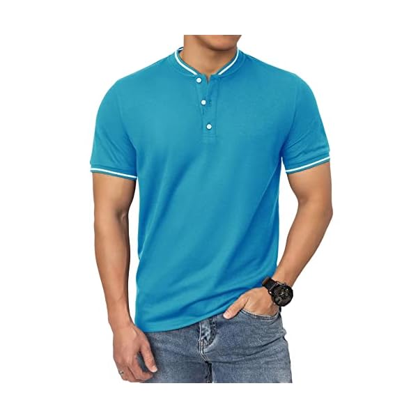 Our Mens henley has a unique and stylish collarless design prevents friction and irritation in the neck area ( 3 button placket) .The athletic cut is stylish but functional. It fits great through the chest and shoulders and you can show your biceps.No restriction in your outdoor movement at all, The feel and comfort of a t-shirt with the flexibility of golf shirt.Extreme movability for your golf swing as the shirt.