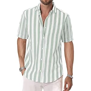 DELCARINO Mens Casual Short-Sleeved Shirt Vertical Stripe Stylish Cotton Linen Shirt Green Medium